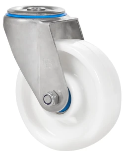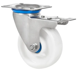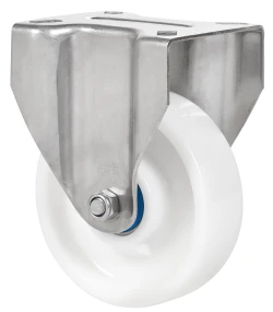 Ruedas de nylon blanco con todos sus componentes de acero inoxidable (AISI 304). Especialmente indicada para soportar cargas hasta 600 Kg.