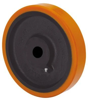 Ruedas con núcleo de acero y banda de poliuretano fundido con dureza de 95˚ shore A, especialmente indicada para soportar altas cargas hasta 1.250 Kg. Con soporte de suspensión elástica mediante incorporación de muelle muy resistente, ideal en suelos irregulares donde su amortiguación actúa.