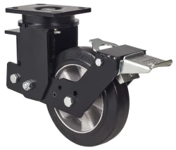 Ruedas de núcleo de aluminio con banda de goma negra elástica con una dureza 70˚ shore A. Especialmente indicada para soportar altas cargas hasta 450 Kg. Con soporte de suspensión elástica mediante incorporación de muelle muy resistente para absorber golpes, choques y desniveles. Recorrido de suspensión hasta 25mm., ideal en suelos irregulares donde su amortiguación actúa.