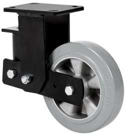 Ruedas de núcleo de aluminio con banda de goma gris elástica con una dureza 70˚ shore A. Especialmente indicada para soportar altas cargas hasta 450 Kg. Con soporte de suspensión elástica mediante incorporación de muelle muy resistente para absorber golpes, choques y desniveles. Recorrido de suspensión hasta 25mm., ideal en suelos irregulares donde su amortiguación actúa.