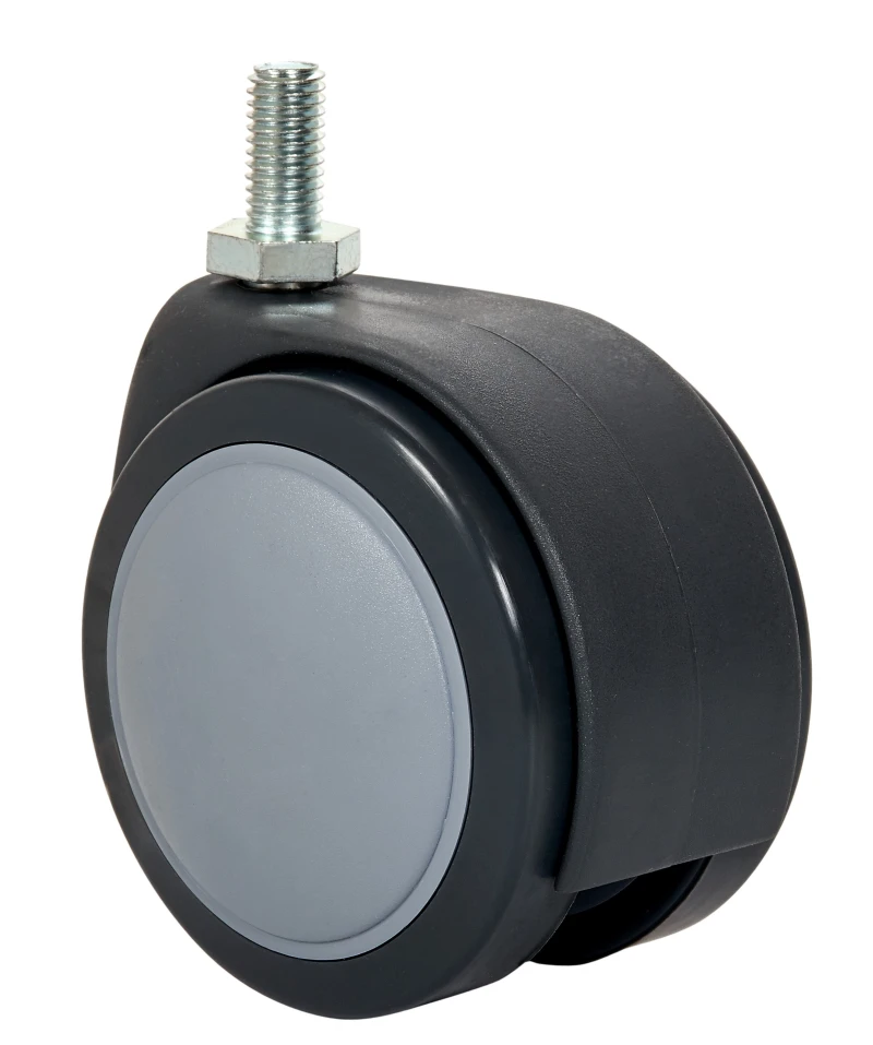 Soporte de poliamida para albergar dos ruedas gemelas. Fijaciones: espiga lisa y espiga roscada. Acabado en poliuretano gris. Diametro de la rueda de 78 mm. Con y sin freno.