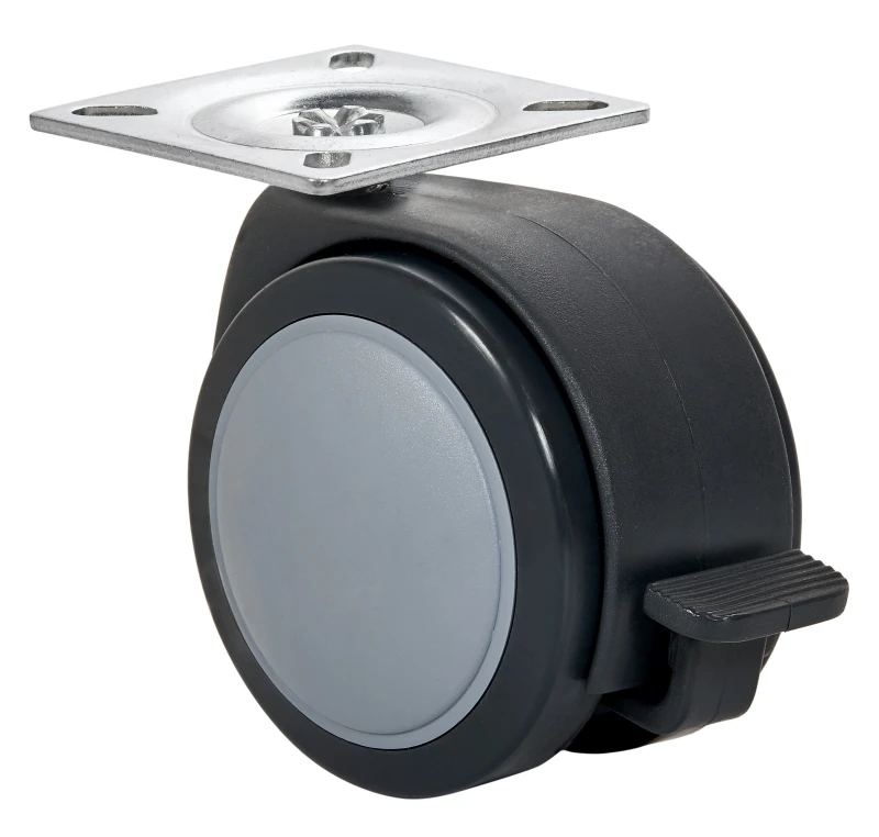 Soporte de poliamida para albergar dos ruedas gemelas. Fijaciones: platina,espiga lisa y espiga roscada. Acabado en poliuretano gris. Diametro de la rueda de 78 mm. Con y sin freno.