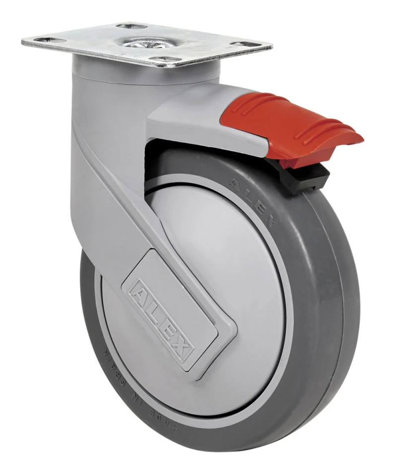 Rueda de goma termoplástica gris inyectada. Soporte fabricado en poliamida de alta calidad endurecida con fibra de vidrio. Cabezal giratorio superior construido en doble hilera de bolas endurecidas (fijación placa y agujero pasante) y cojinete de bolas de precisión insertado (fijación espiga roscada). Especialmente indicadas para soportar cargas hasta 100 Kg.