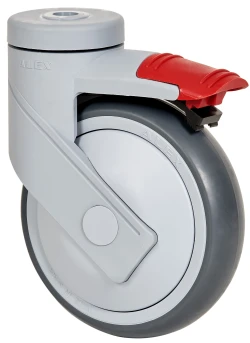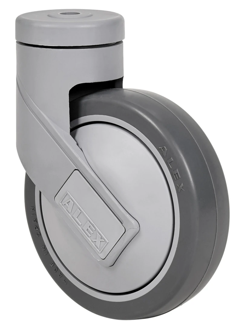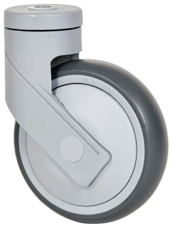 Rueda de goma termoplástica gris inyectada. Soporte fabricado en poliamida de alta calidad endurecida con fibra de vidrio. Cabezal giratorio superior construido en doble hilera de bolas endurecidas (fijación placa y agujero pasante) y cojinete de bolas de precisión insertado (fijación espiga roscada). Especialmente indicadas para soportar cargas hasta 100 Kg.