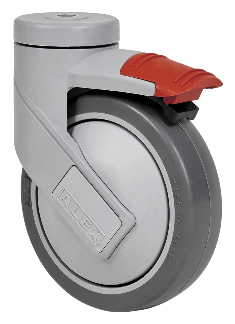 Rueda de goma termoplástica gris inyectada. Soporte fabricado en poliamida de alta calidad endurecida con fibra de vidrio. Cabezal giratorio superior construido en doble hilera de bolas endurecidas (fijación placa y agujero pasante) y cojinete de bolas de precisión insertado (fijación espiga roscada). Especialmente indicadas para soportar cargas hasta 100 Kg.