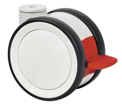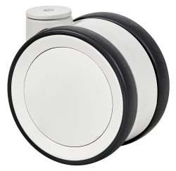 Rueda de poliuretano doble. Carcasa fabricada con fibra de vidrio reforzada. Soporte pivotante de fácil encaje. Cabezal giratorio con doble cojinete de bolas de precisión. Especialmente indicadas para soportar cargas hasta 125 Kg.
