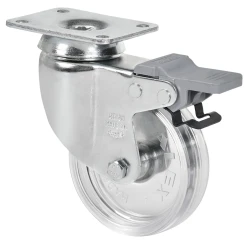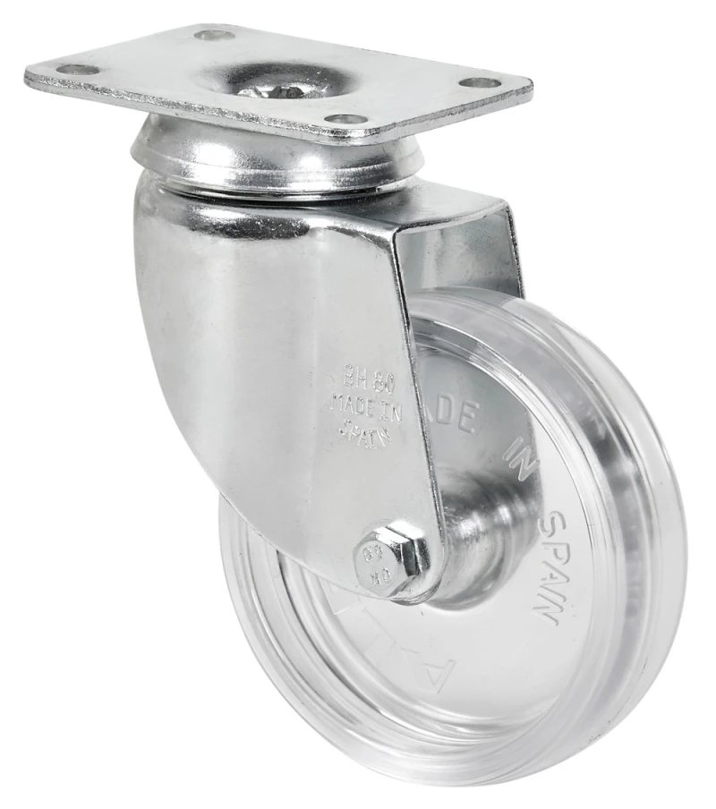 Soporte de chapa de acero. Acabado cromado. Tipo de fijación:Pletina giratoria o agujero pasante. Disponible con freno doble (palanca gris). Aro policarbonato Color de los aros: simil cristal.