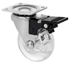 Soporte de chapa de acero con acabado cromado pulido. Tipo de fijación: Pletina giratoria. Aro con centro en policarbonato y bandaje transparente de poliuretano. Disponible con freno.