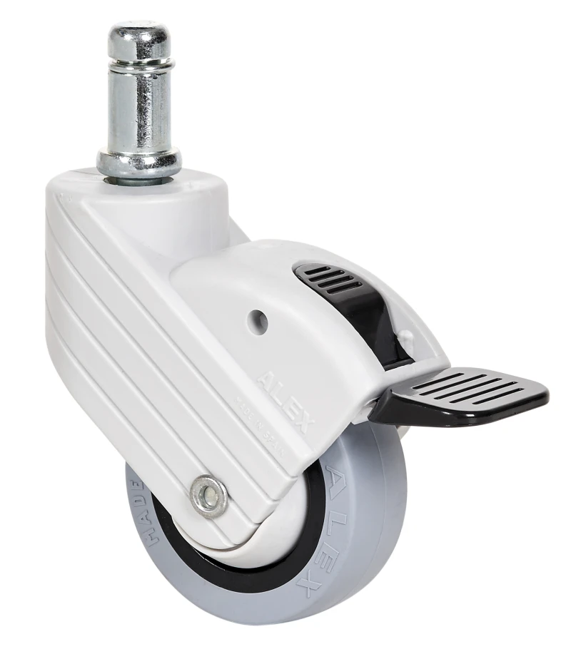 Soporte con placa, espiga lisa o roscada, con y sin freno. Freno ergonómico redondeado con retorno integrado. Fabricadas en poliamix reforzado. Diseñadas epecialmente para el sector mobiliario y restauración. Color personalizado opcional. Fabricadas según normas europeas EN 12528.
