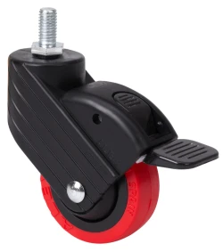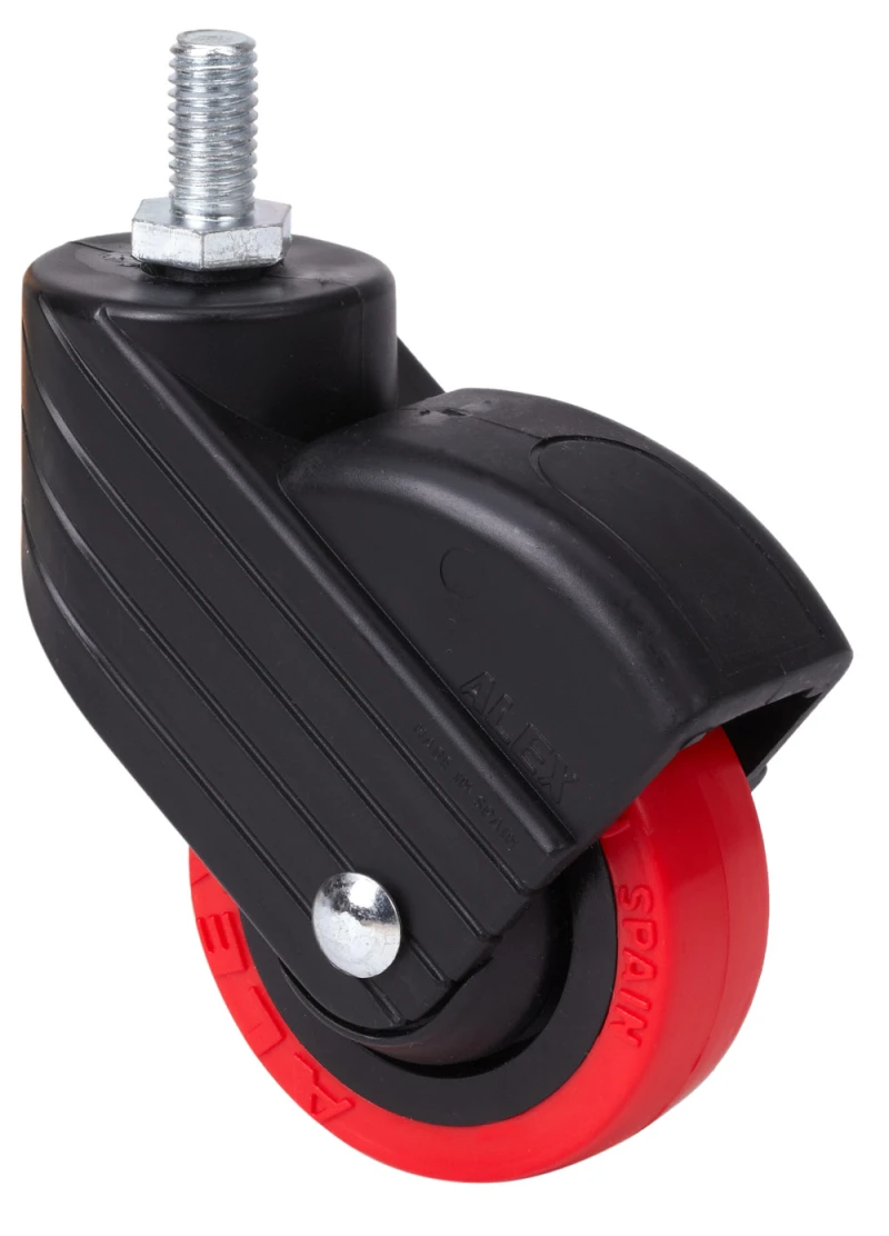 Soporte con placa y espiga roscada, con y sin freno. Freno ergonómico redondeado con retorno integrado. Fabricadas en poliamix reforzado. Diseñadas epecialmente para el sector mobiliario y restauración. Color personalizado opcional. Fabricadas según normas europeas EN 12528.
