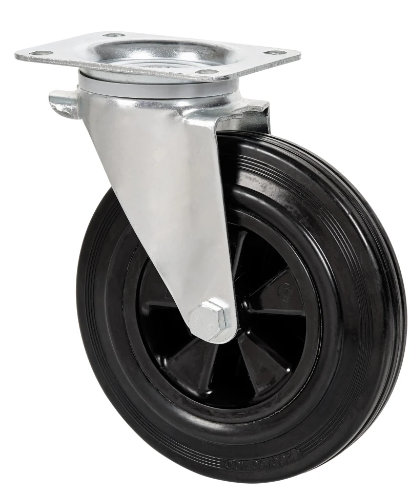 Ruedas de goma negra. Especialmente indicada para soportar cargas hasta 200 Kg.