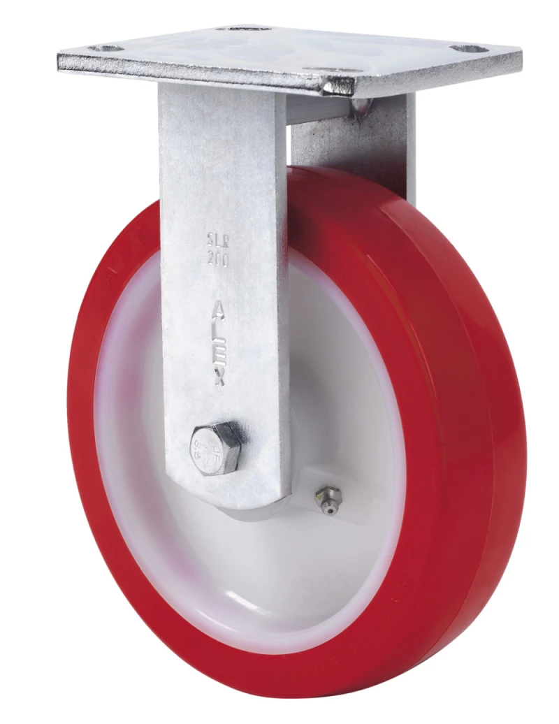 Ruedas con núcleo de nylon blanco y banda de poliuretano rojo dureza 90-95º shore A. Especialmente indicada para soportar altas cargas de hasta 600 Kg.