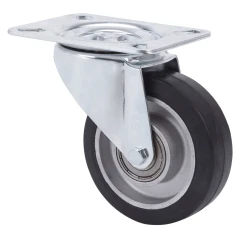 Ruedas de núcleo de aluminio con banda de goma negra elástica con una dureza 70˚ shore A. Especialmente indicada para soportar cargas hasta 250 Kg.