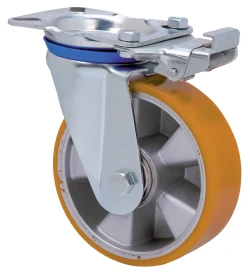 Ruedas con núcleo de aluminio y banda de poliuretano fundido de dureza 95º shoreA. Especialmente indicada para soportar cargas hasta 400 Kg.
