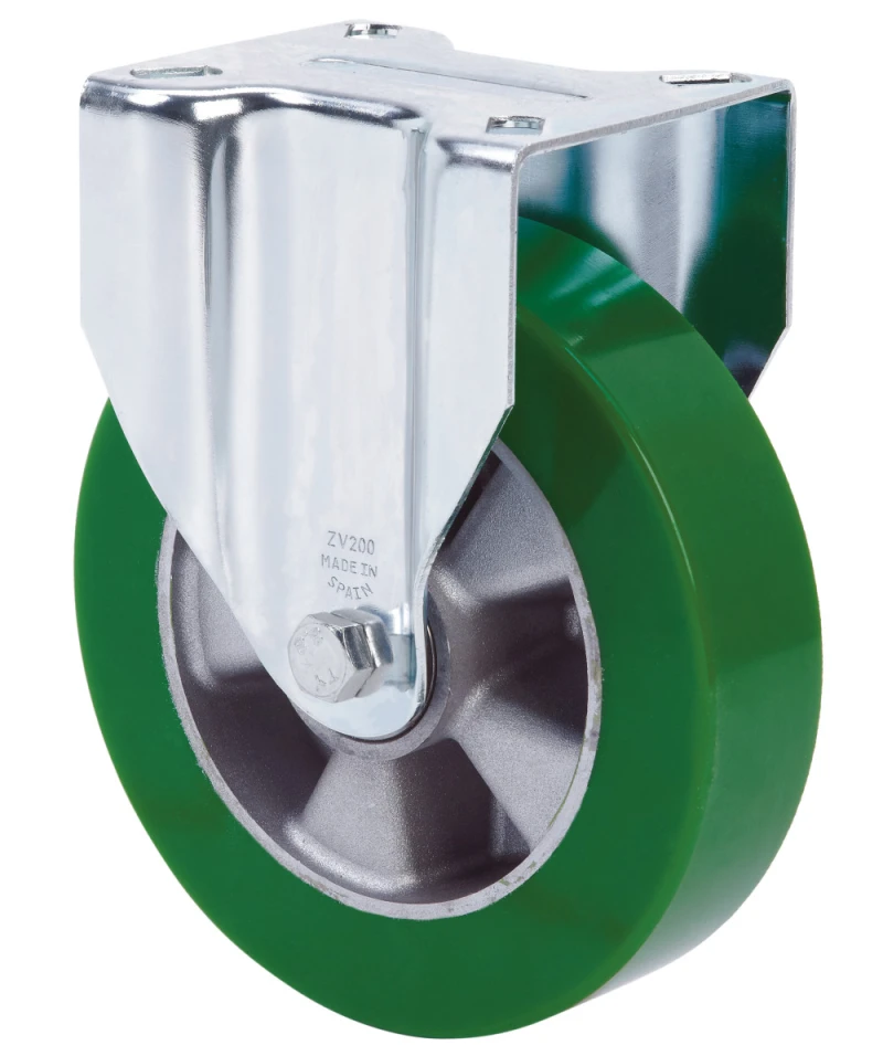 Ruedas con núcleo de aluminio y banda de poliuretano verde de dureza 80º shoreA. Especialmente indicada para soportar cargas hasta 400 Kg.