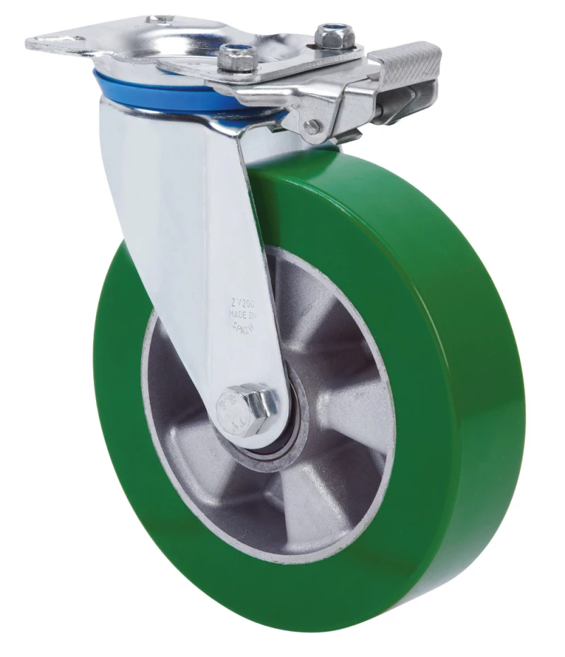 Ruedas con núcleo de aluminio y banda de poliuretano verde de dureza 80º shoreA. Especialmente indicada para soportar cargas hasta 400 Kg.
