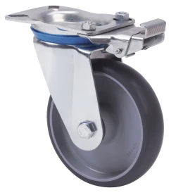 Ruedas de goma gris inyectada con núcleo de poliamix. Especialmente indicada para soportar cargas hasta 180 Kg.