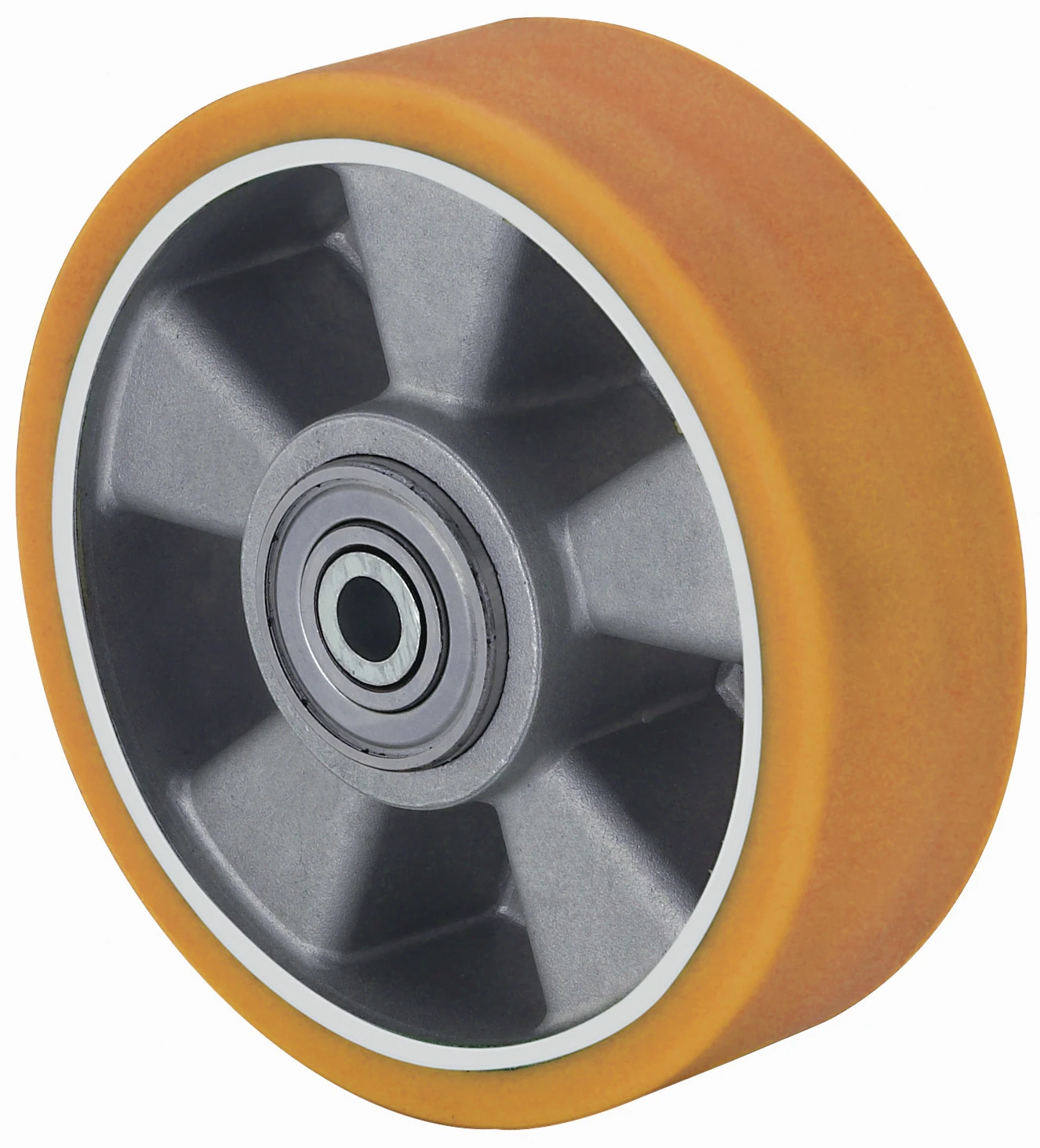 Ruedas con núcleo de aluminio y banda de poliuretano fundido de dureza 95º shoreA. Especialmente indicada para soportar cargas hasta 700 Kg.