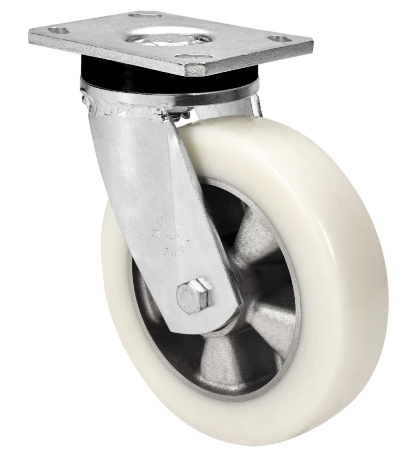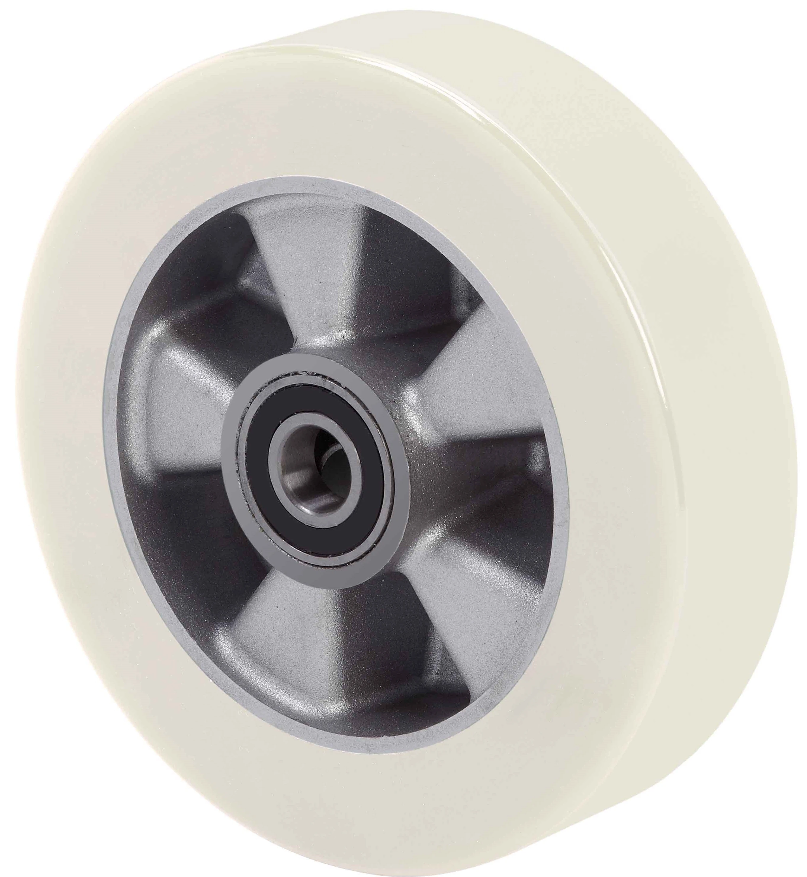 Ruedas con núcleo de aluminio y banda de poliuretano blanco fundido con dureza de 88˚ shore A, especialmente indicada para soportar altas cargas hasta 650 Kg.