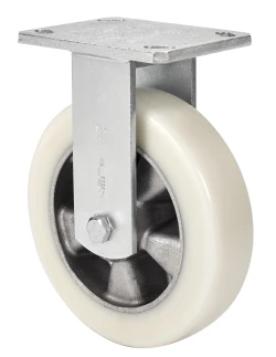 Ruedas con núcleo de aluminio y banda de poliuretano blanco fundido con dureza de 88˚ shore A, especialmente indicada para soportar altas cargas hasta 650 Kg.