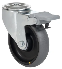 Ruedas conductivas con núcleo de polipropileno y banda de poliuretano gris inyectado. Especialmente indicada para soportar cargas hasta 125 Kg.