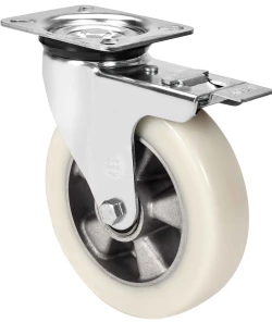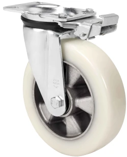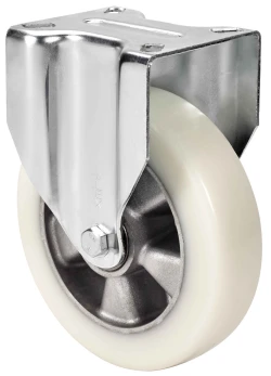 Ruedas con núcleo de aluminio y banda de poliuretano blanco de dureza 88º shoreA. Especialmente indicada para soportar cargas hasta 650 Kg.